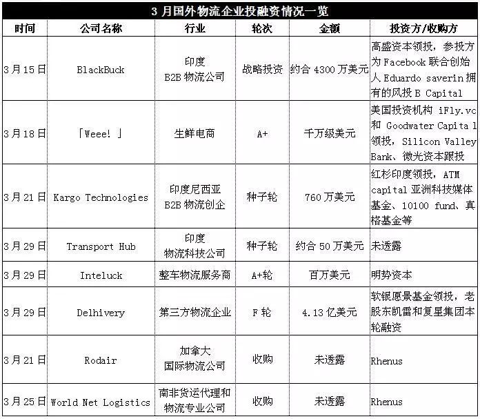 總的來看,國外3月投融資共計8筆,其中企業融資6筆,德國物流巨頭Rhenus一周并購了兩家貨代企業。據不完全統計,投融資總額超31.1億元。