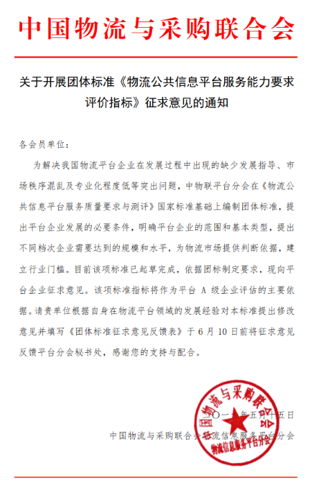 關(guān)于開展團(tuán)體標(biāo)準(zhǔn)《 物流公共信息平臺(tái)服務(wù)能力要求評(píng)價(jià)指標(biāo)》征求意見的通知