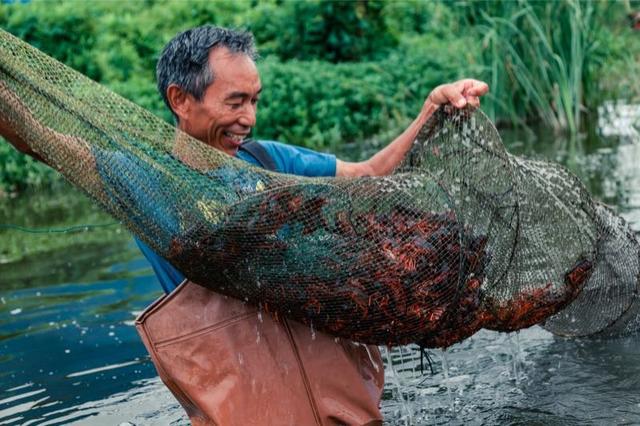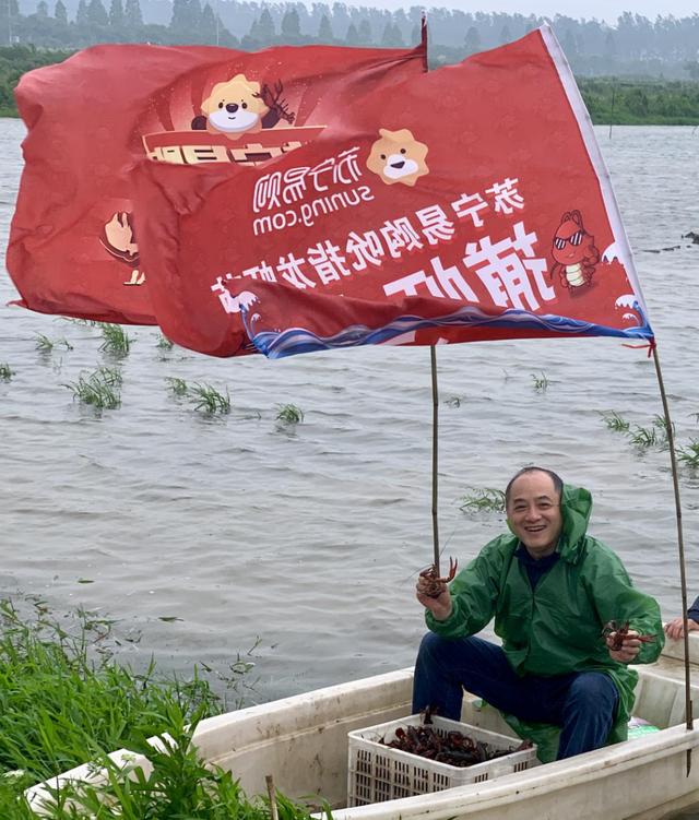 (蘇寧快消集團總裁卞農在蘇寧荊州小龍蝦拼基地撒下今夏小龍蝦第一網)