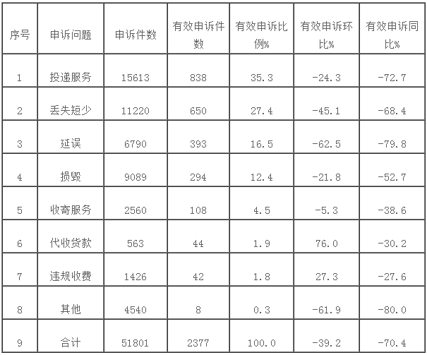 郵政業消費者對郵政服務問題有效申訴404件,環比下降17%,同比下降56.5%。