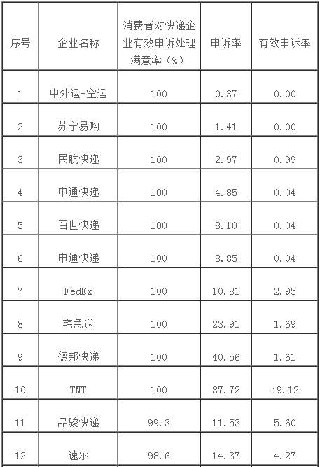 4月,郵政業消費者對全國快遞企業有效申訴處理滿意率平均為97.3%,高于全國平均數的快遞企業有15家,低于全國平均數的有7家;全國快遞服務申訴率平均為10.53,低于全國平均數的快遞企業有10家,高于全國平均數的有12家;全國快遞服務有效申訴率平均為0.48,低于全國平均數的快遞企業有9家,高于全國平均數的有13家。