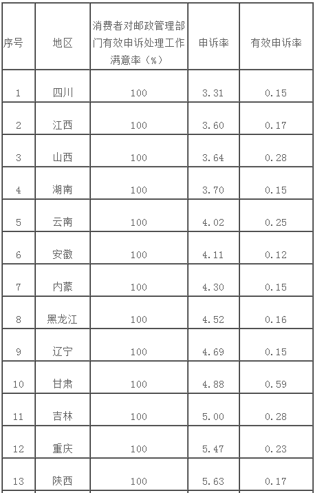 郵政業消費者對各省(區、市)郵政管理部門有效申訴處理工作滿意率(郵政業消費者對郵政管理部門有效申訴處理工作滿意件數與郵政管理部門結案有效申訴總量之比)為98.7%,低于全國平均有效申訴處理滿意率的地區有8個;各省(區、市)快遞服務申訴率(所在省份快遞企業每百萬件收投業務量中發生申訴問題的件數)為5.43,高于全國平均申訴率的地區有19個。