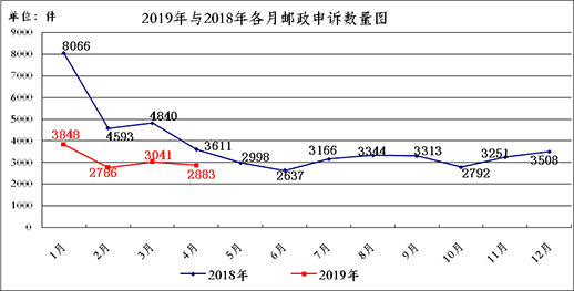 4月,郵政業消費者對郵政服務問題申訴2883件,環比下降5.2%,同比下降20.2%。
