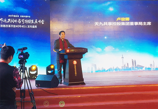 2019年1月19日,由《中國故事》全球傳播理事會、中國經濟新聞聯(lián)播、《中國商界》雜志社等四十家單位聯(lián)合推選的“致敬改革開放40年40人”榜單在京隆重發(fā)布,天九共享董事局主席盧俊卿榮膺“中國最具影響力十大公益人物”并應邀作為獲獎代表現場發(fā)表演講。他表示,今年,天九共享將加大精準扶貧力度,再捐2億元,繼續(xù)支持各地工商聯(lián)的“萬企幫萬村”活動。