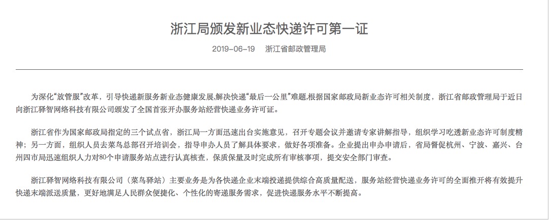今年2月國家郵政局發(fā)布《國家郵政局辦公室關(guān)于企業(yè)開辦服務(wù)站經(jīng)營快遞業(yè)務(wù)許可試點(diǎn)工作的通知》提到,為深化快遞領(lǐng)域“放管服”改革,引導(dǎo)快遞新服務(wù)新業(yè)態(tài)健康發(fā)展,對同一市(地)范圍內(nèi)以開辦多個(gè)服務(wù)站的創(chuàng)新方式經(jīng)營快遞業(yè)務(wù)的企業(yè),要依法保護(hù)和規(guī)范其經(jīng)營活動(dòng),并選取浙江省、福建省和山東省作為試點(diǎn),對企業(yè)開辦服務(wù)站經(jīng)營快遞業(yè)務(wù)實(shí)施許可。作為三個(gè)試點(diǎn)之一,浙江省對80個(gè)申請服務(wù)站點(diǎn)進(jìn)行認(rèn)真核查后,頒發(fā)了菜鳥驛站的首張開辦服務(wù)站經(jīng)營快遞業(yè)務(wù)許可證。