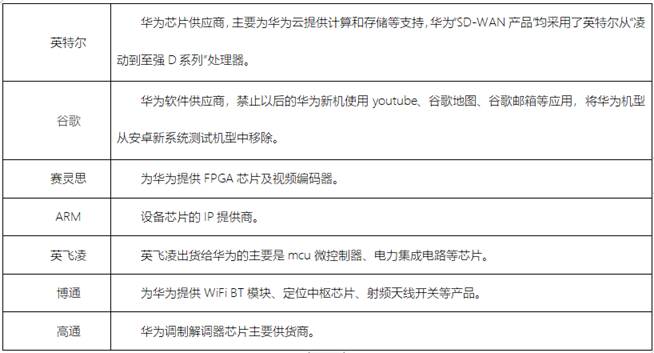 時(shí)下,圍繞制造業(yè)供應(yīng)鏈領(lǐng)域最為熱議的莫過關(guān)于“貿(mào)易戰(zhàn)”與“華為”的話題。美國(guó)將家具和汽車零部件等一系列價(jià)值2000億美元的中國(guó)商品的關(guān)稅提高到25%。隨后,作為回應(yīng),中國(guó)提出對(duì)價(jià)值600億美元的美國(guó)商品征收關(guān)稅。緊接著美國(guó)威脅要對(duì)所有剩余的價(jià)值約3000億美元的中國(guó)出口產(chǎn)品征稅,實(shí)體制造業(yè)被推到風(fēng)口浪尖。從美國(guó)商務(wù)部將華為列入“實(shí)體清單”之后,已經(jīng)有多個(gè)國(guó)際巨頭中斷了與華為的業(yè)務(wù)往來,包括半導(dǎo)體企業(yè)高通、博通、英偉達(dá)、英特爾、AMD、美光、聯(lián)發(fā)科,在軟件上微軟和谷歌對(duì)華為也做出了限制,幾家企業(yè)在華為供應(yīng)鏈上的職能如下: