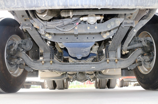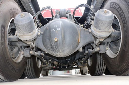 驅動橋采用兩個440輕量化后橋,后橋速比3.7,允許荷載18噸。大馬力+小速比的黃金動力鏈組合,可以實現體系節油。