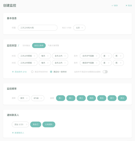 心知天氣智能預警方案,能夠實現全自動的天氣信息監控: 根據用戶設定的天氣規則條件,實時監控天氣數據,一旦觸發用戶設定的條件,將自動通過短信、郵件、微信、釘釘等方式,第一時間推送至用戶終端,幫助企業提前應對極端天氣,部署安全生產策略。