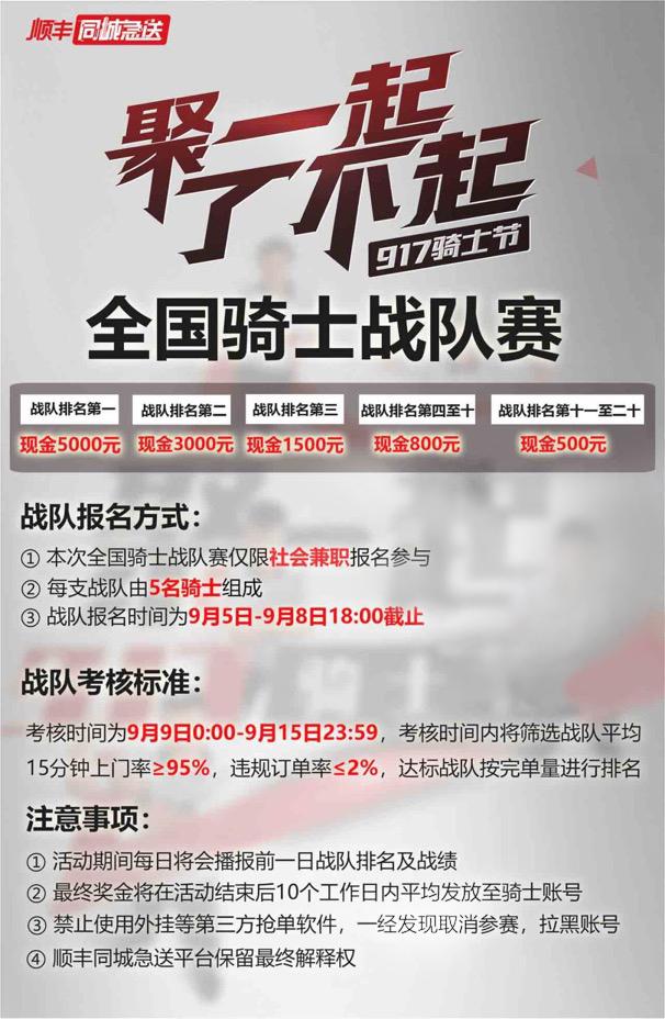 同時(shí),針對(duì)社會(huì)兼職騎士,順豐同城同樣有驚喜送出。9月5日-8日18:00期間,所有社會(huì)兼職騎士均可報(bào)名參加由順豐同城舉辦的"聚一起、了不起"全國(guó)騎士戰(zhàn)隊(duì)賽活動(dòng)。兼職騎士們可自由組成5人小隊(duì)報(bào)名,考核評(píng)選入圍前十二名的戰(zhàn)隊(duì)均可活動(dòng)現(xiàn)金獎(jiǎng)勵(lì),最高獎(jiǎng)金達(dá)5000元。