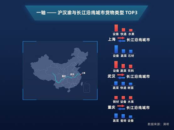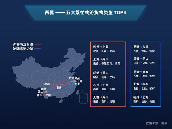 滬蓉高速連接了長(zhǎng)三角、長(zhǎng)江中游、成渝三大城市群的主要城市,貨量TOP3由沿線重要城市上海、蘇州、無錫、成都、重慶占據(jù)。長(zhǎng)三角內(nèi),上海與蘇州無錫之間的貨運(yùn)密集,且多以設(shè)備類為主;成都、重慶作為西南地區(qū)“雙子星”,兩地間的貨運(yùn)也比較多,樹苗、蔬菜、飲料、家具建材等是成都向重慶運(yùn)輸?shù)闹饕浳铩?/p>