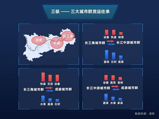 “三極”指的是長(zhǎng)三角、長(zhǎng)江中游和成渝三大城市群。《綱要》指出,要充分發(fā)揮中心城市的輻射作用,打造長(zhǎng)江經(jīng)濟(jì)帶的三大增長(zhǎng)極。滿幫大數(shù)據(jù)顯示,三大城市群占據(jù)了帶內(nèi)大部分的公路運(yùn)輸量,僅三極內(nèi)部運(yùn)輸總量就占到帶內(nèi)總量的39%,三極貨物類型呈現(xiàn)各自的產(chǎn)業(yè)特征。