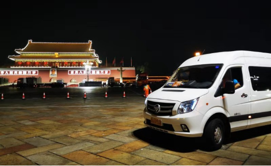 大會(huì)期間,天安門廣場(chǎng)上的一對(duì)“紅飄帶”主題景觀為莊嚴(yán)肅穆的廣場(chǎng)渲染了喜慶熱烈的氛圍。“紅飄帶”采用了全預(yù)制裝配式、全冷連接的建造方式完成搭建,共有1000多塊單元進(jìn)行拼接完成。據(jù)了解,搭建方從9月初便開啟每天不足5個(gè)小時(shí)的緊急運(yùn)輸搭建任務(wù)。時(shí)間緊任務(wù)重,每天晚上工作人員根據(jù)現(xiàn)場(chǎng)需要進(jìn)行建筑構(gòu)件運(yùn)輸,這要求現(xiàn)場(chǎng)指揮人員需迅速到達(dá)現(xiàn)場(chǎng)指揮設(shè)備落地并搭建,以保證景觀的順利展出。福田圖雅諾每天往返大興基地到天安門廣場(chǎng)6趟零故障出行,其舒適性更受到搭建運(yùn)輸指揮人員的一致認(rèn)可。