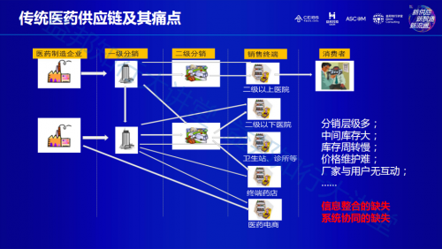作為大健康領域的另一個行業,醫藥行業有著比保健品行業更嚴格的要求。醫藥行業并不是一個開放市場,需要有相關資質才能從事醫藥的銷售。制藥企業和醫院、藥店之間存在許多分銷商,供應鏈條不透明是整個醫藥行業存在的問題。