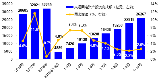 1-10月,交通固定資產(chǎn)投資完成26267億元,同比增長2.6%。公路水路完成投資19231億元,同比增長3.4%,提前完成全年1.8萬億元任務(wù)目標(biāo),其中公路建設(shè)完成投資18093億元、增長2.6%,水運(yùn)建設(shè)完成投資897億元、下降2.2%,在取消高速公路省界收費(fèi)站深入推進(jìn)的帶動(dòng)下,支持系統(tǒng)等其他建設(shè)完成投資241億元,大幅增長445.3%。