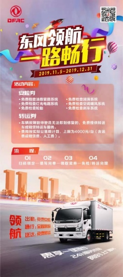 選一輛品質過硬又優惠實在的好車是基本,服務自然也不能落后。為贏戰雙十二物流高峰,東風輕型車還針對所有快遞、物流客戶制訂“東風領航 一路暢行”真美滿貨運無憂專項服務方案,11月5日至12月31日,所有客戶均可享“6大全車免檢+2大轉運服務支持”,即提供含車輛油路管路系統、空調暖風系統、剎車系統等6項全車免費檢查,免費轉運車或租賃轉運車2項貨運轉運服務,助力廣大卡友高效出勤全程無憂。