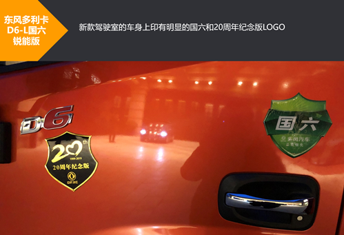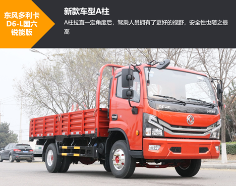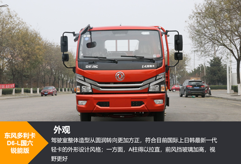 多利卡D6銳能版采用全新平臺設計,除前臉繼承了家族式造型外,A柱拉直10°,頂蓋加高加寬70mm,前風窗和門洞線加高100mm;還可加裝流線形“王冠”造型導流罩,美觀的同時,有效地減小了車輛高速行駛時的空氣阻力,從而降低燃油消耗;“DFAC”和“東風多利卡”的標識也從老平臺的漆面挪到風擋玻璃下方黑色區域,更加明顯,極具識別度。