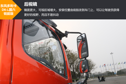 多利卡D6采用框架式鏡桿和加寬后視鏡,可視區域增大到135°,側、后部視野盡攬無余,足以應對2550mm極限外寬貨廂;雨刮采用了無骨雨刷,相較傳統的有骨雨刮,質量更輕,刮水效果也會更好,且刮臂加長,刮刷區域增大18%,雨天行車更安全。