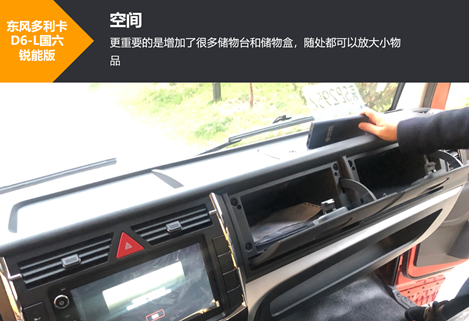儲物空間增多是多利卡D6改進后的又一個亮點。多利卡D6的儲物空間共有18處,其中,新增了頂蓋儲物盒和副儀表雜物盒,加之儀表板開放式儲物盒、置物平臺、手套箱、卡槽等,已能保證大部分的儲物需求。當這些空間仍不能滿足用戶的需求時,還可將副駕駛的座椅放下,在其背后有著不遜于副駕駛前方的儲物空間的儲物盒和兩個杯托。