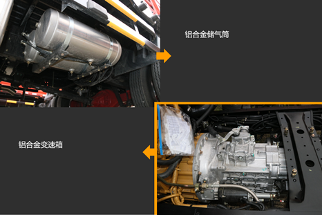 這輛多利卡D6在輕量化上下足了功夫,車輛的輪輞、變速箱、儲氣筒、油箱等部件均采用了鋁合金材質;還有高強度鋼車身和真空胎,進一步降低了車輛自重。