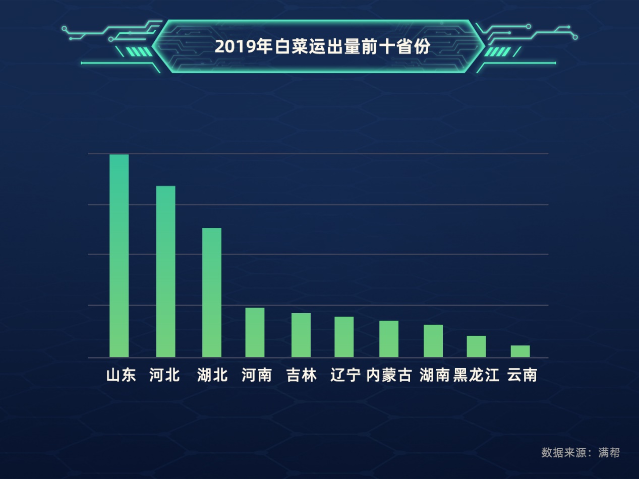 白菜主要輸出區域以北方為主,山東、河北、吉林、湖北、河南都是白菜輸出大省,其中,山東是絕對的主力。2019年,山東白菜輸出量占到了全國總量的四分之一,輸出量占比同比上漲了11%,同時,河北白菜輸出量占比也呈現上升狀態,從2018年的17.4%提升到21.6%,占比同比上漲24%。白菜供給跌幅明顯的是吉林,2019年輸出量占比狂跌到3.2%,占比同比下降了68%,從輸出量前三省份跌到了第五。