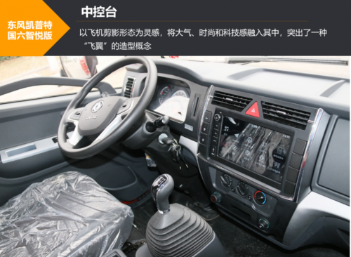 新一代東風凱普特國六智悅版的中控臺以飛機剪影形態為靈感,將大氣、時尚和科技感融入其中,突出了一種“飛翼”的造型概念,呈現出“舒展、長遠”的感覺,其平直的橫向線條,凸顯出駕駛室內的寬敞與大氣。