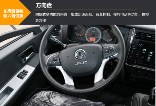 駕駛室內部,新一代東風凱普特國六智悅版提升了駕駛室內的空間,由于側頂加寬了76mm,門洞上邊框抬高了100mm,頭部活動空間得到有效提升。
