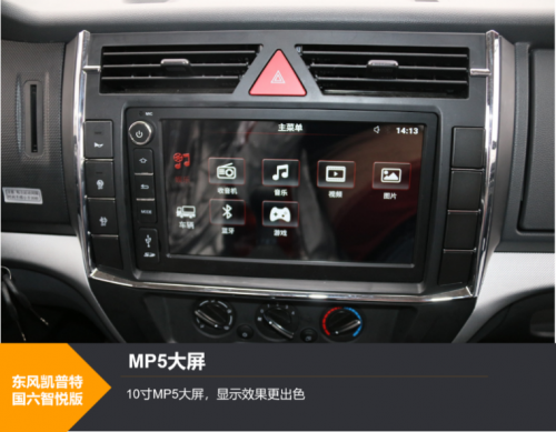 當然,這款東風凱普特國六智悅版在內飾方面最大的亮點是其搭載的10寸MP5大屏。配MP5顯示屏對當下的輕卡來講并不稀奇,但是配10寸這么大的MP5大屏在輕卡內飾中并不常見;這款大屏不僅能為用戶提供更好的娛樂效果,還可更好地顯示倒車影像。