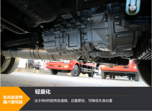 匹配這款日產NISSAN發動機的是法士特6擋鋁殼變速箱,自重更輕。其實,不只是在變速箱,新款東風凱普特國六智悅版在很多地方都做了輕量化處理。比如少片簧、鋁合金輪輞、鋁合金飛輪殼、鋁合金儲氣筒、鋁合金油箱等。在物流行業發展越來越規范化的今天,輕量化是用戶必然的選擇。