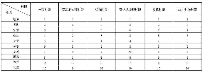 2019年10家快遞服務品牌主要時限指標排名表現(xiàn)