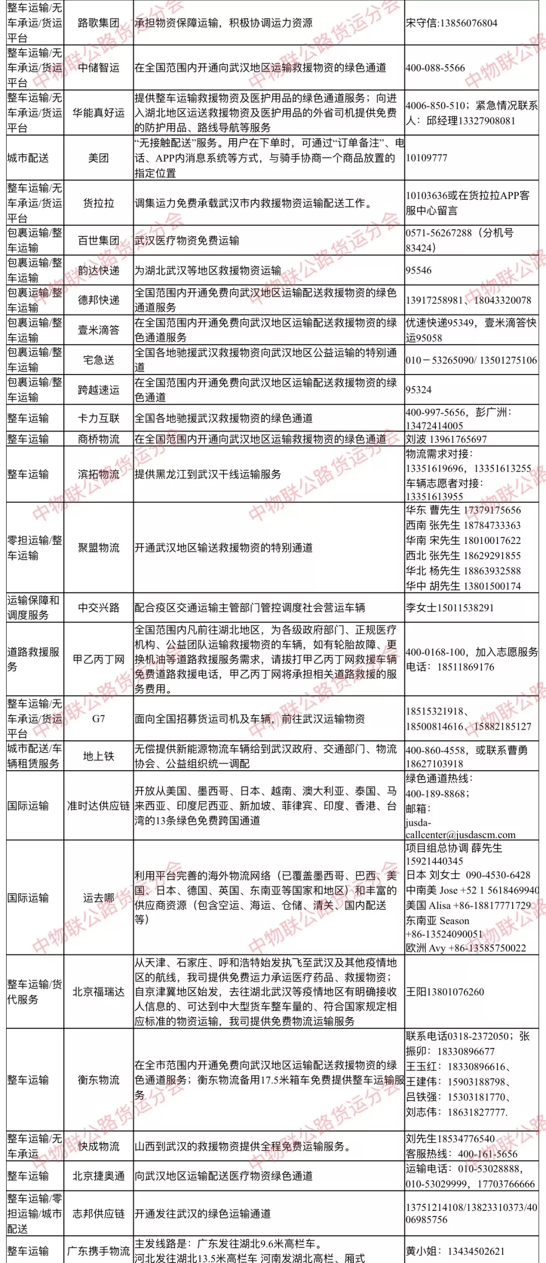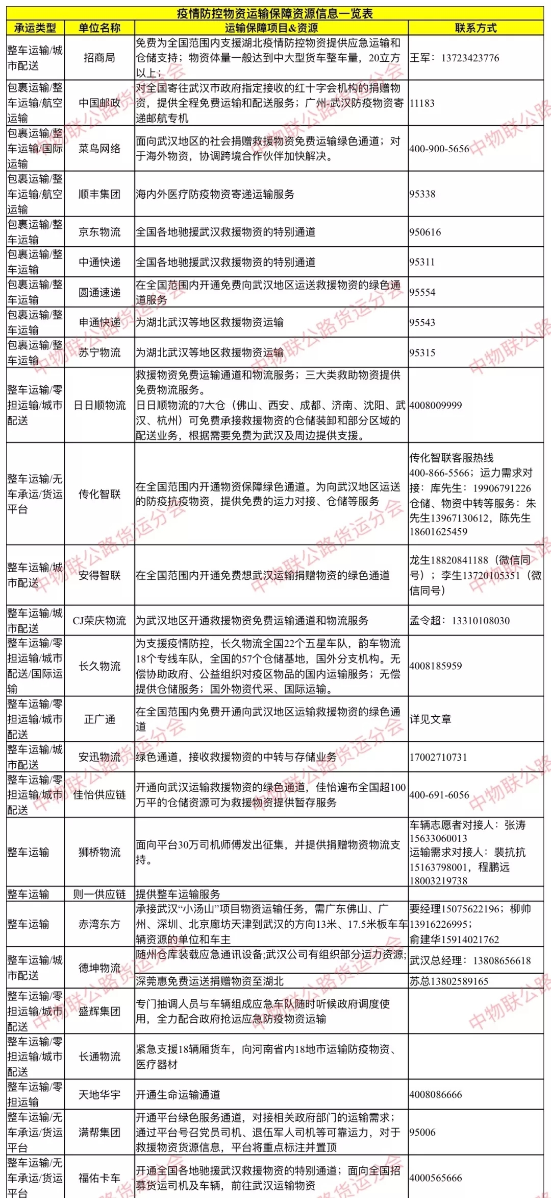 一方有難、八方支援,湖北武漢疫情牽動著廣大貨運物流人的心。目前,已經(jīng)有50多家星級車隊和貨運物流企業(yè)正式提供疫情防控物資運輸保障服務(wù),為疫情防控物資提供免費運輸和物流業(yè)務(wù)。為加強供需信息對接、團結(jié)形成合力,中物聯(lián)公路貨運分會特整理匯總了“疫情防控物資運輸保障資源信息一覽表”,請有相關(guān)運輸需求的單位和企業(yè)撥打?qū)m椔?lián)系電話,具體對接運輸保障事宜。