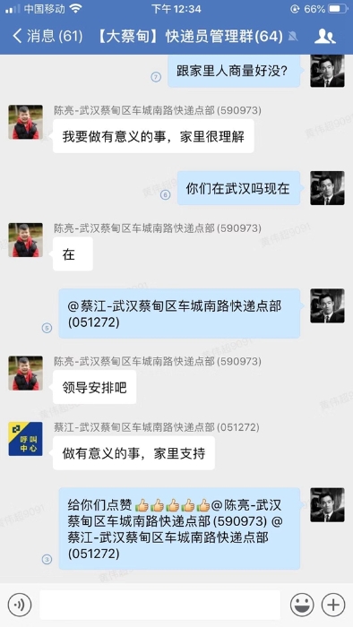 1月26日,張超在企業微信中看到需要人員幫忙運送在高速路口進不來的救援物資時,當即主動請纓,表示可隨時上崗。