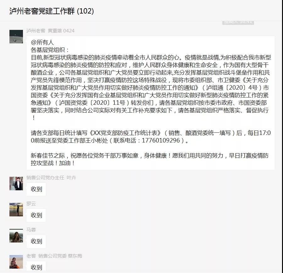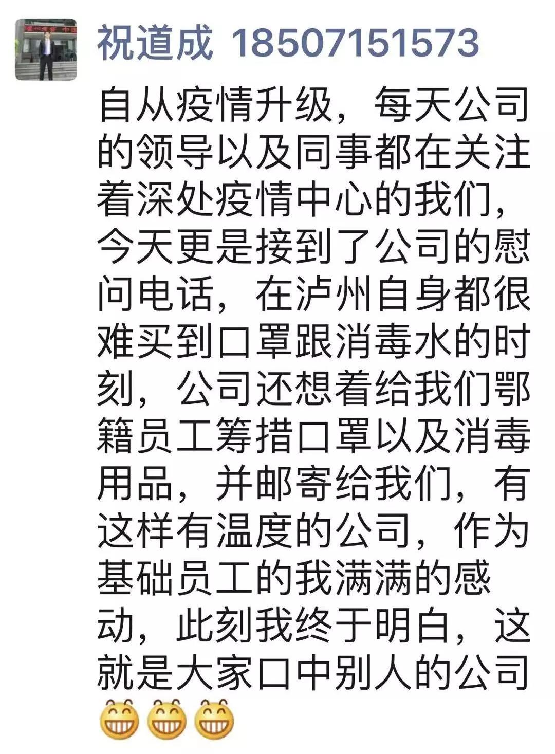“坐在家里還能接到總公司的電話,詢問身體及家人情況,是否需要公司給予物資上的幫助。感謝公司!本人堅決按照公司指示,不亂跑,不串門。”特曲公司鄂東客服經(jīng)理張東波在朋友圈曬出了自己接到的公司慰問電話。特曲公司鄂西客服經(jīng)理畢云則表示:“心里暖暖的,年初二公司領(lǐng)導(dǎo)還在為我們籌措物資,關(guān)心員工健康情況。我為自己是一名瀘州老窖國窖人而自豪,激動。”