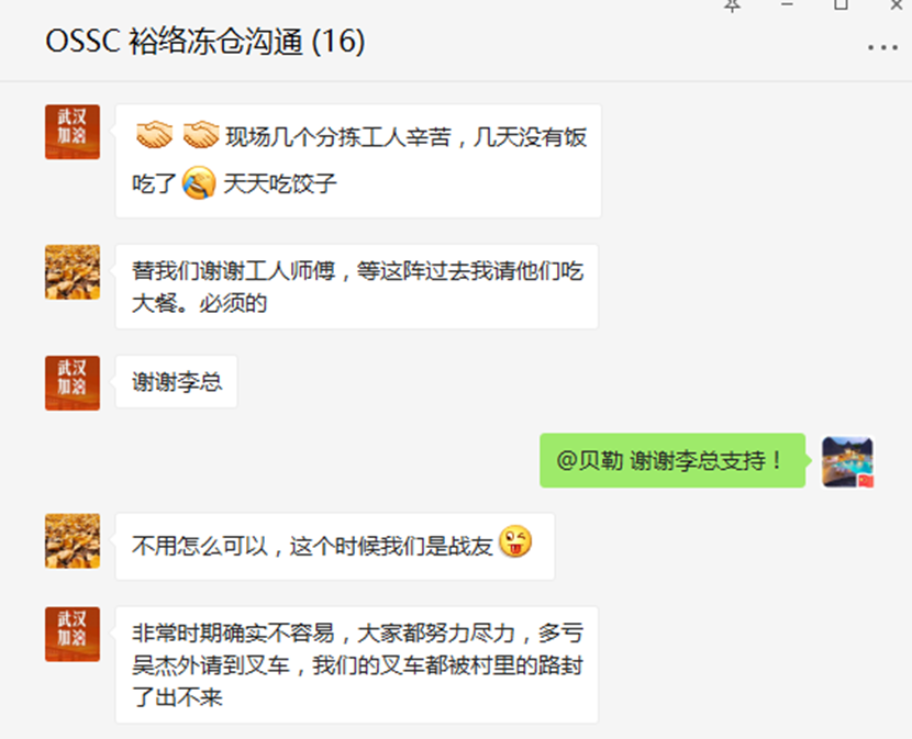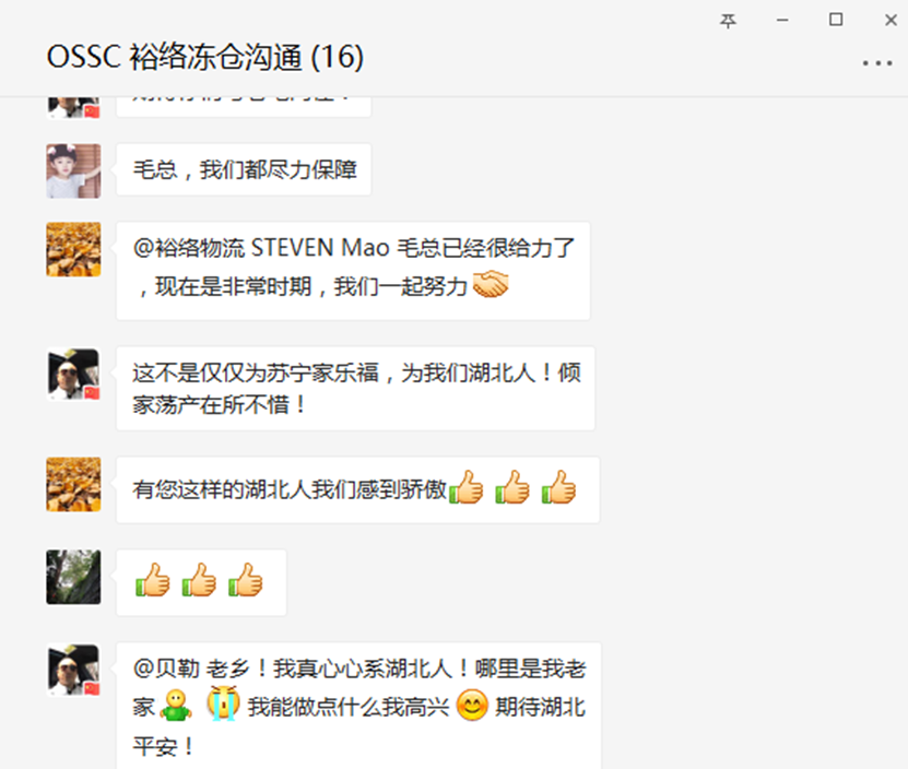 面對困難,裕絡人沒有被嚇倒!而是積極想辦法克服、應對:一方面在毛董事長的親自指揮下,武漢裕絡積極行動起來,成立專門的疫情保障團隊,員工紛紛放棄休息,幾乎24小時分班、輪流作業。由于封城、封村,倉庫周邊買不到任何吃的東西,在家樂福團隊的支持下,在與倉庫分開、獨立的辦公室內用電磁爐煮水餃吃,配送的司機只能干吃方便面。