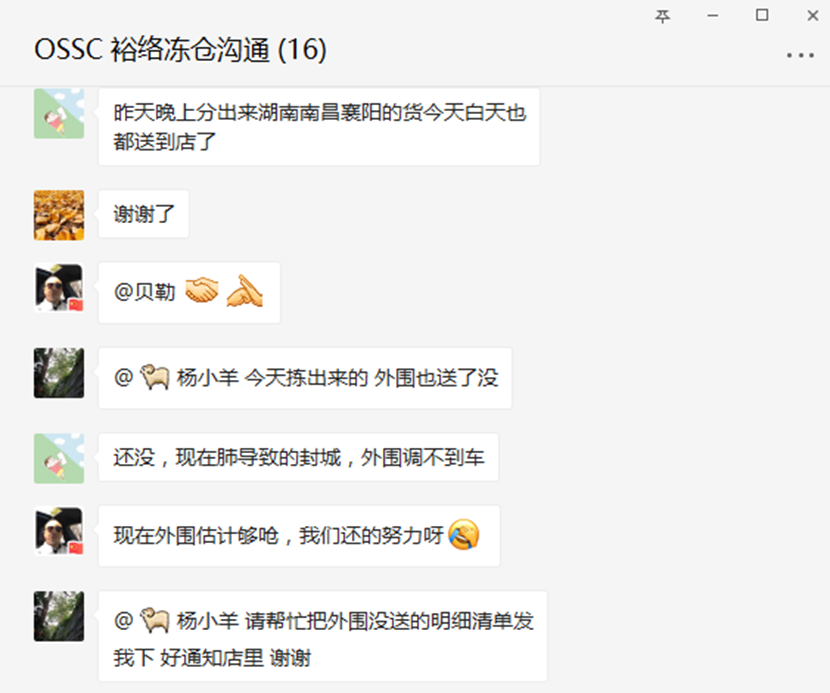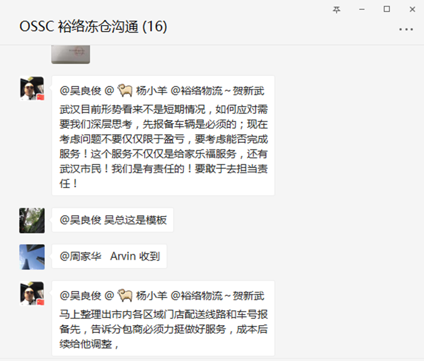 另一方面與家樂福成立雙方工作團隊,建立微信溝通群,及時分享信息,請家樂福協調門店、政府等部門,確保我們的車輛能上路、按時配送。