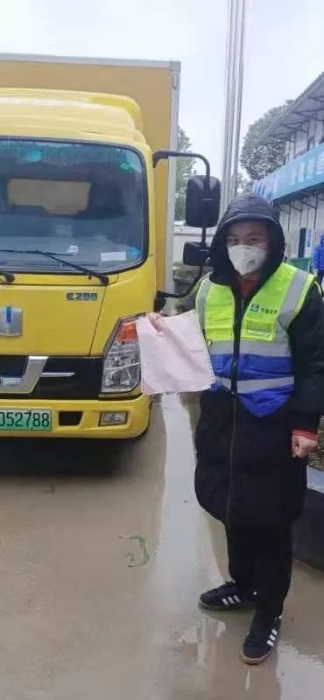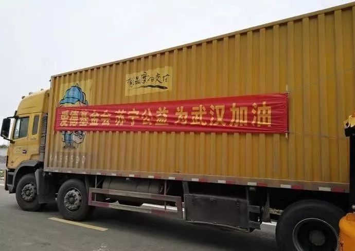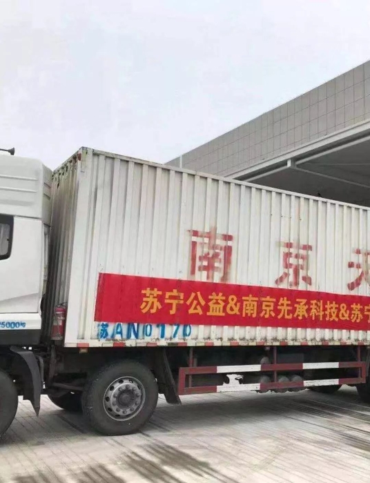 1月24日,一輛從蘇寧南京總部緊急發送、滿載防疫物資的物流車抵達蘇寧華中物流園。這些物資包括口罩、消毒液、防護服等,用以支援醫護人員、記者等一線防控工作者。蘇寧易購和愛德基金將向武漢捐贈10噸消毒水。
