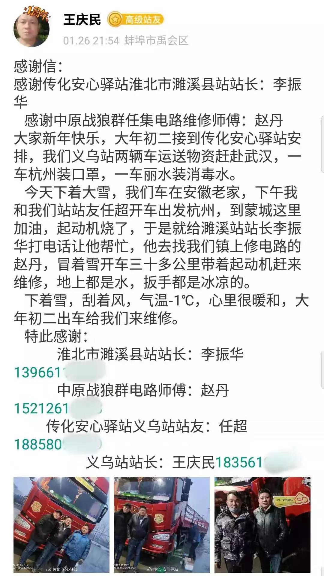 緊急馳援,共克時艱。為支援疫情防控,1月25日起,傳化智聯聯合傳化·安心驛站在全國范圍內開通支援物資綠色物流通道,得到了28個省市301個安心驛站的2.2萬站友以及傳化智能物流平臺上全國卡車司機和物流企業的響應。