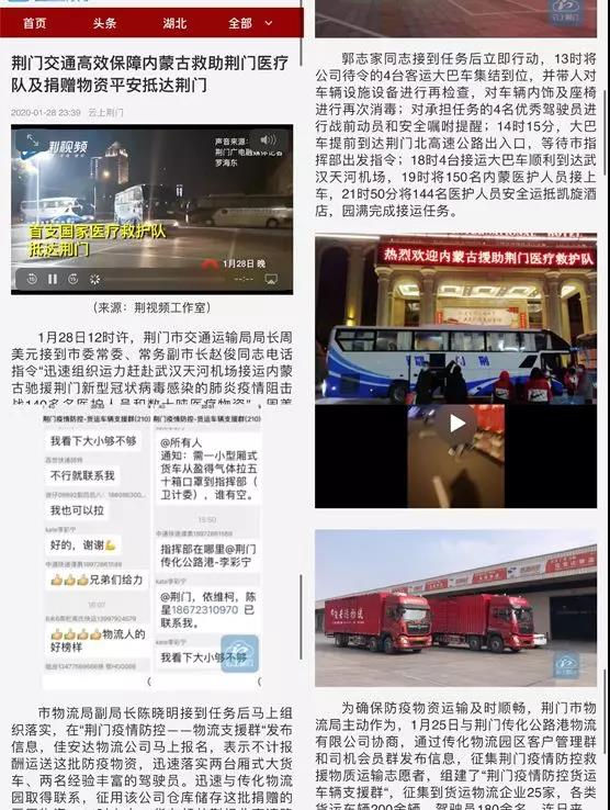 截至目前,群內凝聚起荊門地區30余家物流企業,180余名駕駛人員,儲備貨運車輛210輛,累計完成多家醫院、政府部門的救援物資、生活物資的運輸任務18起。