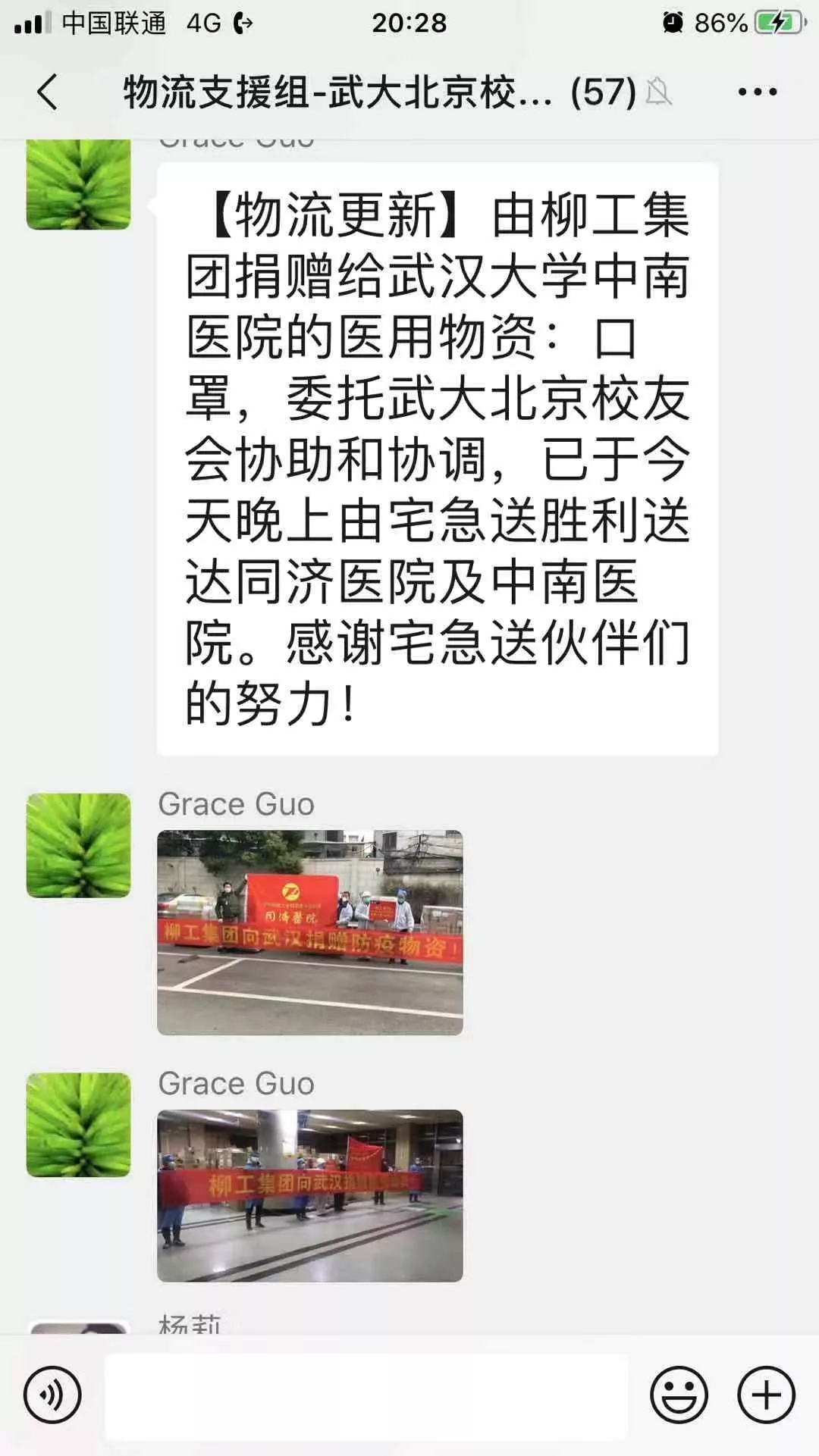 2月3日下午5點,由柳工集團從韓國采購的10萬醫用口罩、護目鏡、防護服物資(武大校友負責的捐贈項目)經宅急送廣東分公司彭斌、寇彥榮43小時的驅車輾轉,已順利送達武大中南醫院和武漢同濟醫院。
