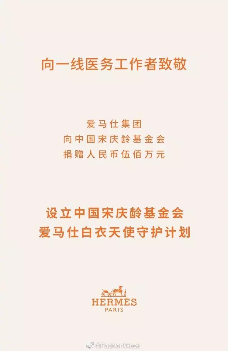2月4日,法國奢侈品集團愛馬仕(Hermès )設立中國宋慶齡基金會愛馬仕白衣天使守護計劃,并向中國宋慶齡基金會捐贈人民幣500萬元。