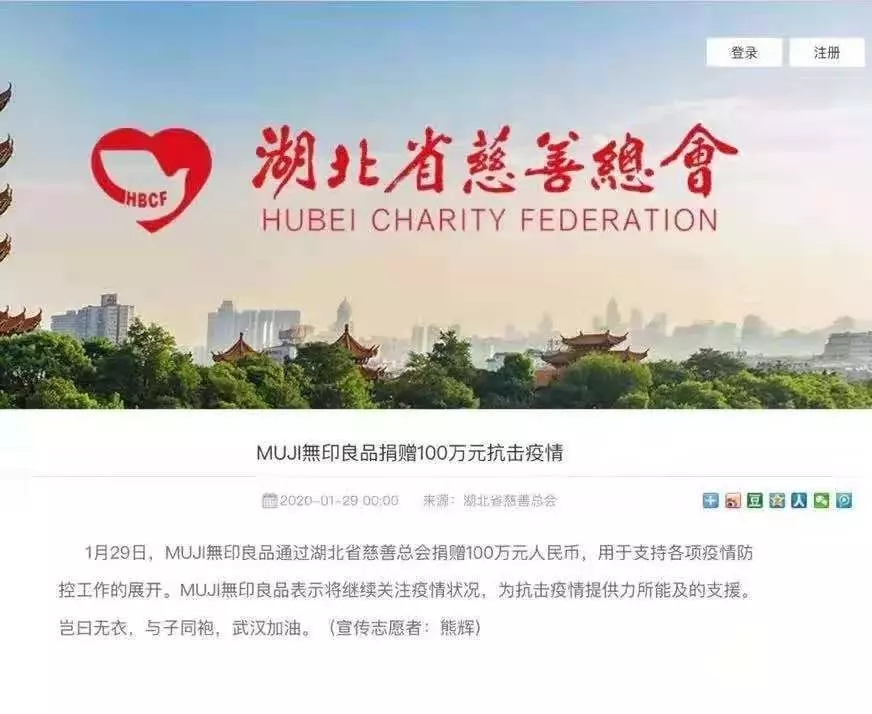 1月29日,日本時尚品牌無印良品(Muji)通過湖北省慈善總會捐贈100萬元人民幣,用于各項防疫防控以及醫療工作的展開。