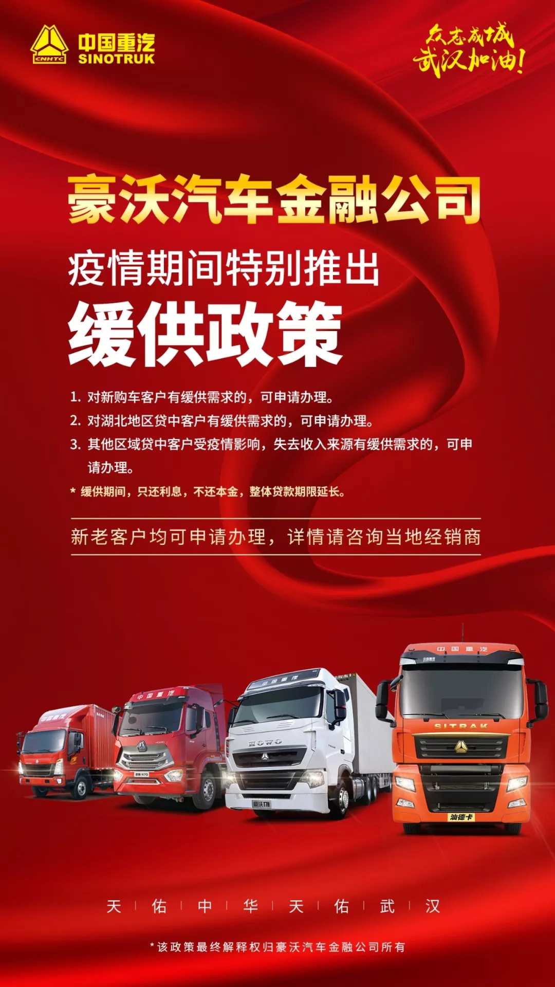 為共同抵抗疫情,更好踐行“客戶滿意是我們的宗旨”的企業(yè)核心價值觀,中國重汽集團豪沃汽車金融公司特別推出緩供政策: