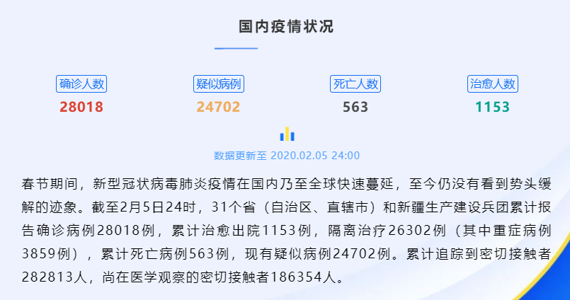 春節期間,新型冠狀病毒肺炎疫情在國內乃至全球快速蔓延,至今仍沒有看到勢頭緩解的跡象。截至2月5日24時,31個省(自治區、直轄市)和新疆生產建設兵團累計報告確診病例28018例,累計治愈出院1153例,隔離治療26302例(其中重癥病例3859例),累計死亡病例563例,現有疑似病例24702例。累計追蹤到密切接觸者282813人,尚在醫學觀察的密切接觸者186354人。