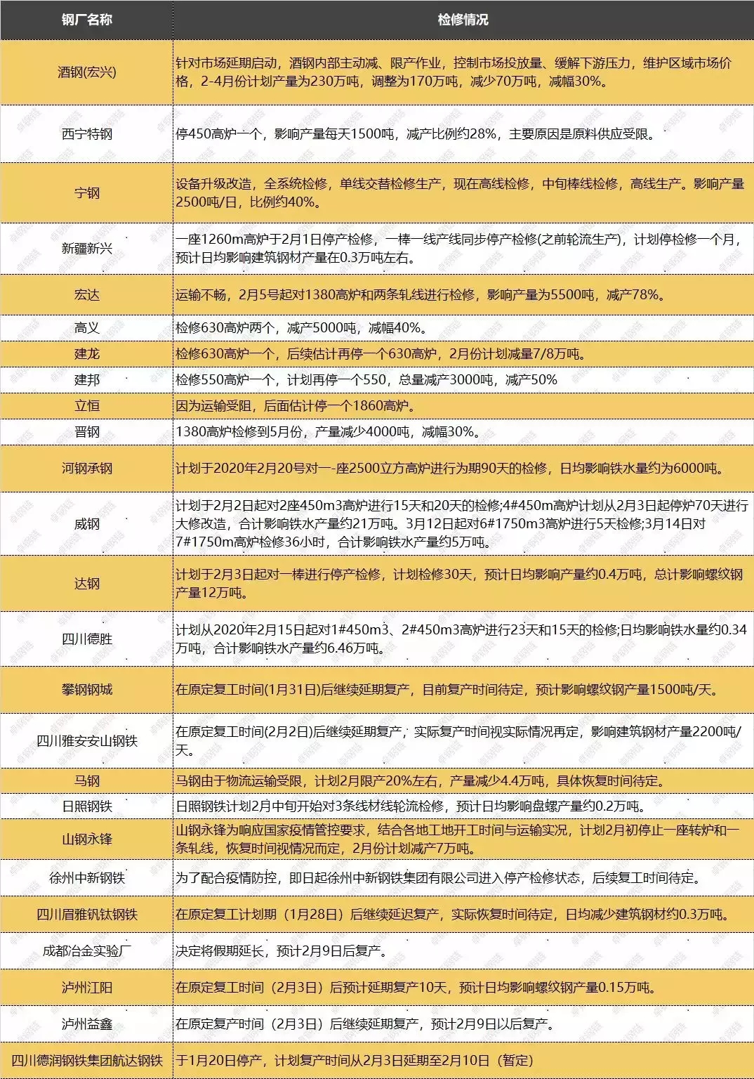 疫情對鋼鐵生產企業排產形成較大擾動,由于需求下降、運輸緊張以及員工安全等因素,部分鋼廠成品材庫存大幅累積,同時原材料庫存備貨不足,導致開始被動減產。長流程鋼廠方面,春節期間多數鋼企生產基本正常,節后唐山、山東、安徽部分長流程鋼廠相繼宣布限產20%-25%。西部地區前期剛完成檢修的生產線由于安全因素,計劃延遲恢復生產。鞍鋼、馬鋼等部分計劃2月份檢修的鋼廠則因為安全因素,往后推遲生產線檢修。