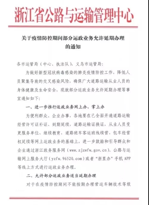 浙江省公路與運輸管理中心相關負責人表示,為便利群眾、企業辦事,同步做好新型冠狀病毒感染的肺炎疫情防控工作,降低人員聚集導致的交叉感染風險,已向各地市下發《關于疫情防控期間部分運政業務允許延期辦理的通知》,要求進一步推行運政業務網上辦、掌上辦,允許部分運政業務辦理和逾期道路運輸證件注銷程序適當延期。