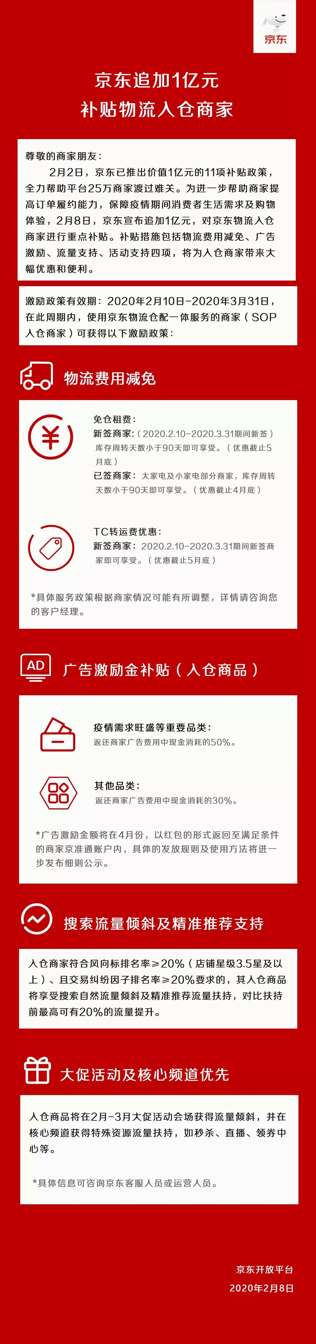 為了在疫情期間進(jìn)一步幫助商家恢復(fù)正常經(jīng)營,保障和提升商家的物流能力,同時(shí)保障消費(fèi)者的購物需求和體驗(yàn),2月8日,京東宣布再追加1億元,對(duì)京東物流入倉商家進(jìn)行重點(diǎn)補(bǔ)貼。此次的補(bǔ)貼措施共有物流費(fèi)用減免、廣告激勵(lì)、流量支持、活動(dòng)支持等4項(xiàng),將為入倉商家?guī)泶蠓膬?yōu)惠和便利。