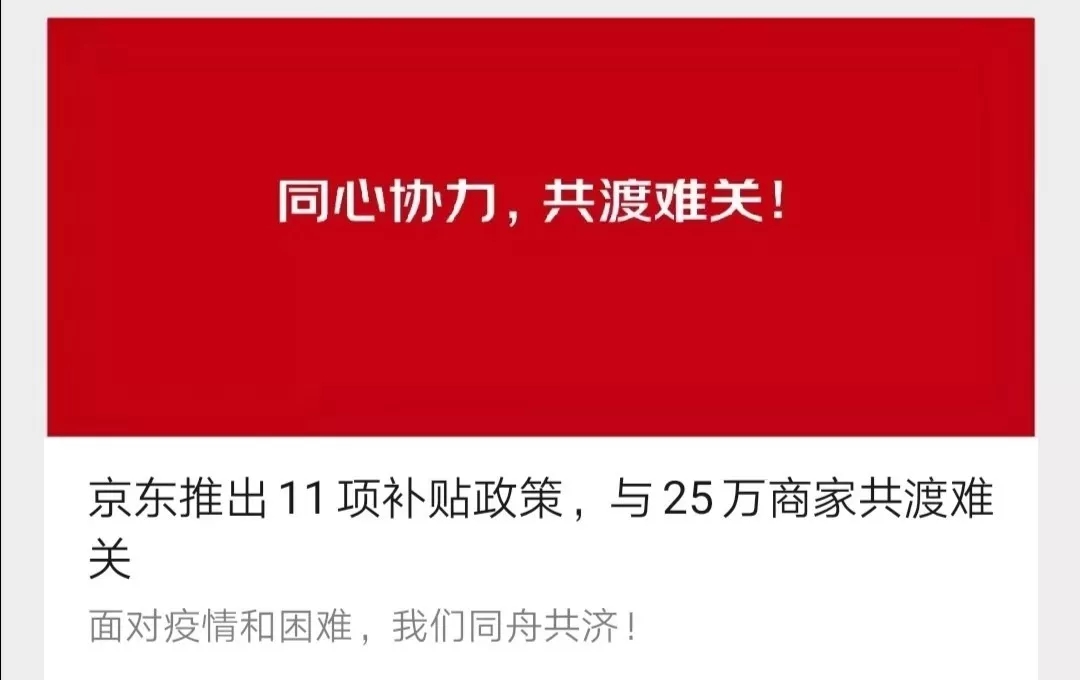 為了幫助廣大商家渡過難關(guān),京東已于2月2日面向平臺(tái)25萬商家推出包括費(fèi)用減免、金融和物流支持、技術(shù)支持等在內(nèi)的11項(xiàng)補(bǔ)貼措施,總價(jià)值達(dá)1億元。