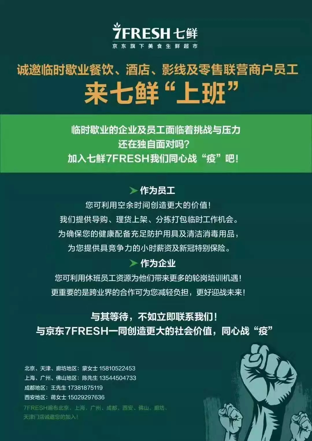 2月5日,為了在特殊時(shí)期促進(jìn)就業(yè),京東7FRESH發(fā)布了“人才共享”計(jì)劃,面向全國招募臨時(shí)員工,誠邀臨時(shí)歇業(yè)的員工在此期間以短期打工的方式加盟。目前,大洋世家等多家餐飲企業(yè)員工開始到京東七鮮超市上班。