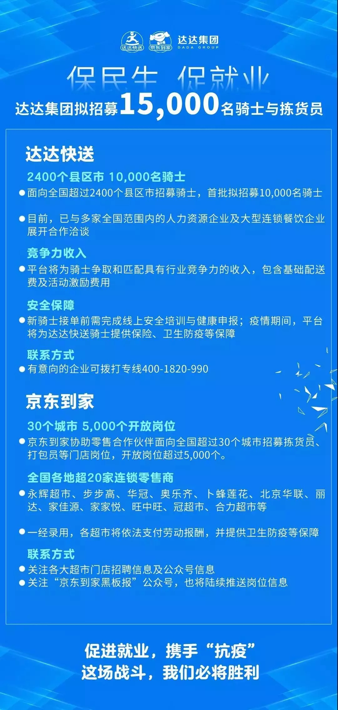 2月7日,為了幫助中小企業(yè)紓困,全力支持穩(wěn)就業(yè)、保民生工作,京東集團(tuán)及其投資的達(dá)達(dá)集團(tuán)(下屬京東到家平臺(tái)和達(dá)達(dá)快送平臺(tái))聯(lián)合宣布將采取靈活多樣的用工形式,面向全社會(huì)提供超過35000人的就業(yè)崗位,通過余缺調(diào)劑、崗位共享等創(chuàng)新模式,最大程度的減少疫情在短期內(nèi)對(duì)就業(yè)產(chǎn)生的沖擊,全力支持湖北及全國取得這場抗疫情、撐經(jīng)濟(jì)、保民生戰(zhàn)役的最后勝利。