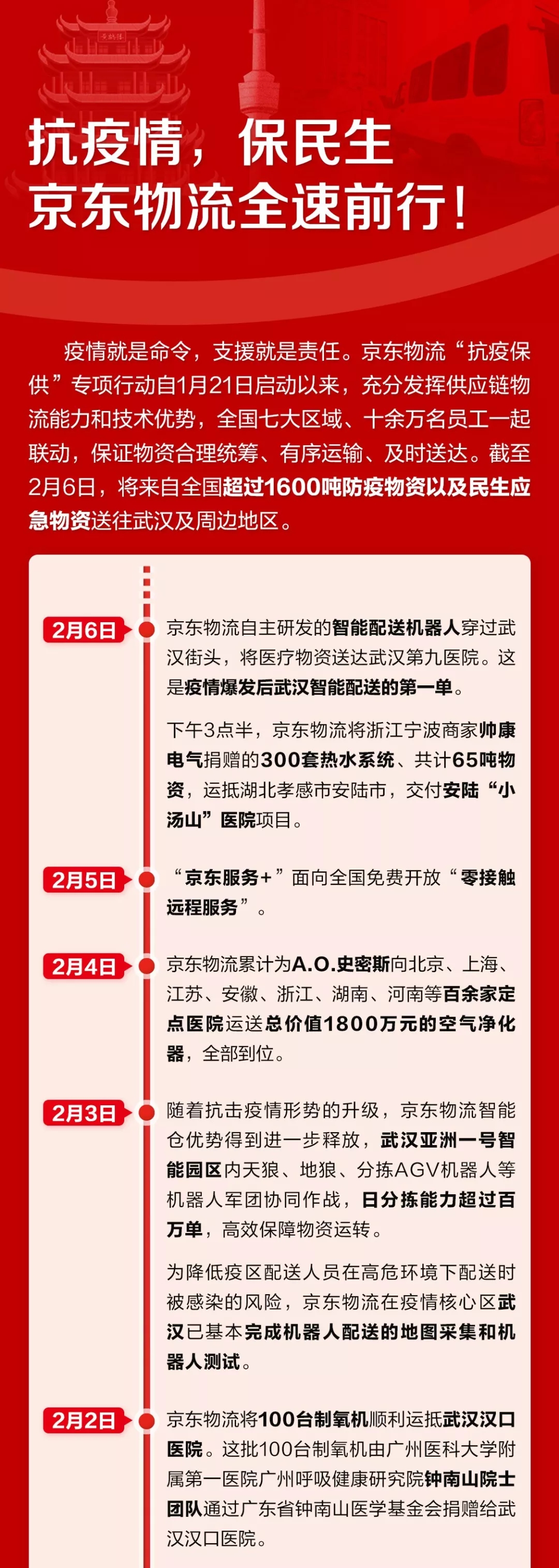 疫情就是命令,支援就是責任。疫情發生以來,京東物流充分發揮供應鏈物流能力和技術優勢,全速運轉、全力保障防疫救援與民生物資的及時送達。截至2月6日,京東物流已將來自全國超過1600噸防疫物資以及民生應急物資送達武漢及周邊地區。