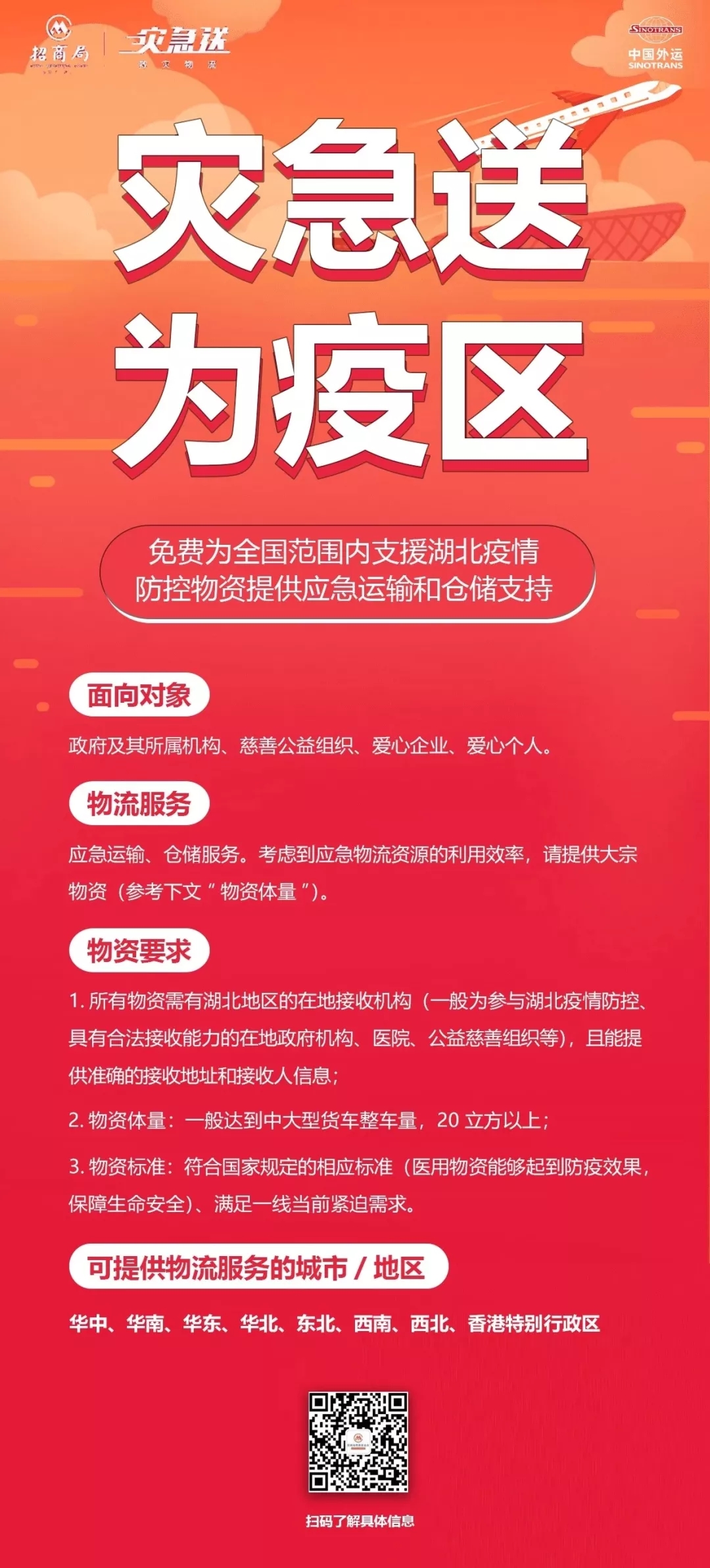 新冠肺炎疫情發(fā)生以來,招商局集團(tuán)迅速動員旗下港口、公路、航運(yùn)、物流等各企業(yè)積極投身應(yīng)急物資運(yùn)輸保障服務(wù)中,建立應(yīng)急物資運(yùn)輸通聯(lián)機(jī)制,啟動“災(zāi)急送”應(yīng)急物流平臺,全力馳援武漢應(yīng)急醫(yī)院建設(shè),積極承運(yùn)各類防疫醫(yī)療物資和疫區(qū)群眾生活必需品,暢通重點(diǎn)物資運(yùn)輸綠色通道,開辟境外捐贈物資服務(wù)窗口,勇于擔(dān)當(dāng)應(yīng)急運(yùn)輸中堅(jiān)力量。